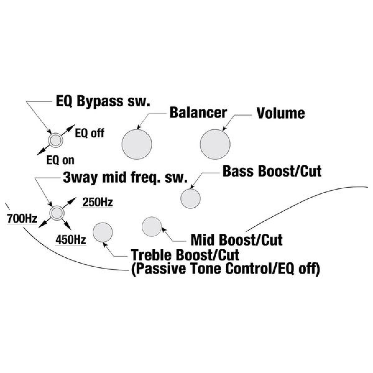• Interruptor de bypass de equalização (controle de tom passivo no potenciômetro de agudos);