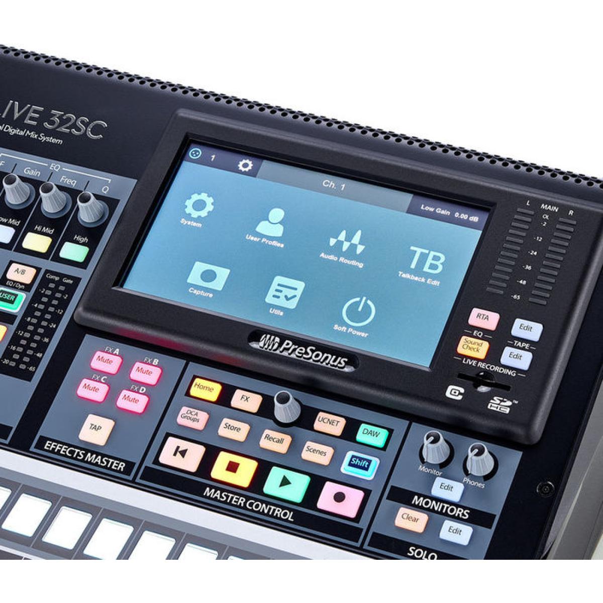 O StudioLive 32SC se adapta tanto ao estúdio como fora de turnê. Oferecendo 40 in / 40 out USB. Sinta-se à vontade para fazer live instantâneas por meio da função de gravação SD integrada. PreSonus objetivo da vintage em seu som por meio da inclusão de EQ de estilo e heritage Volte à era de ouro da gravação com uma variedade de reverbs e delays detalhados. Garanta o acesso remoto via controle sem fio, permitindo que você ajuste as configurações via computador ou dispositivo inteligente.
