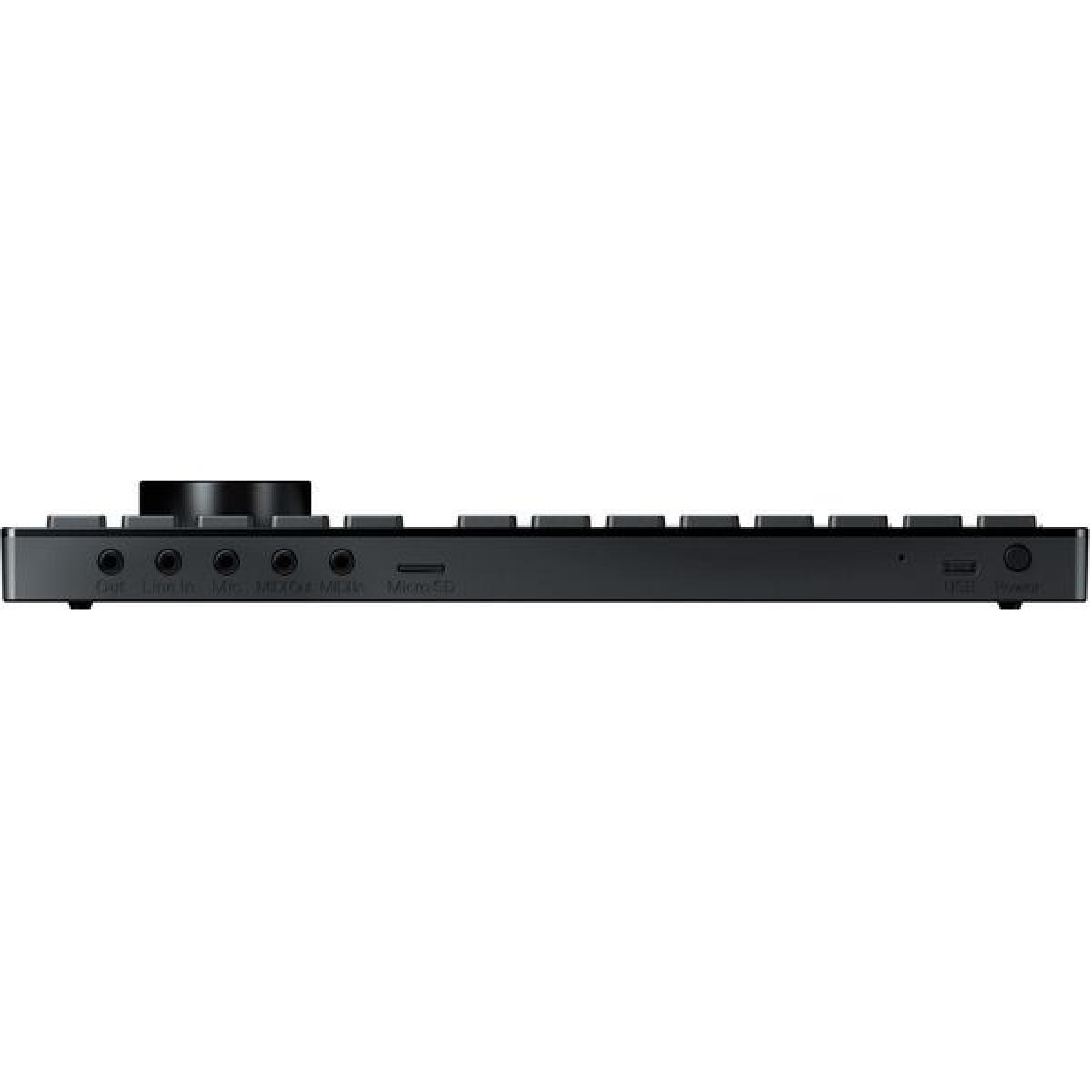 • Entrada/Saída MIDI: conetor de 3,5 mm incluindo adaptador para tomada DIN de 5 pinos ;
