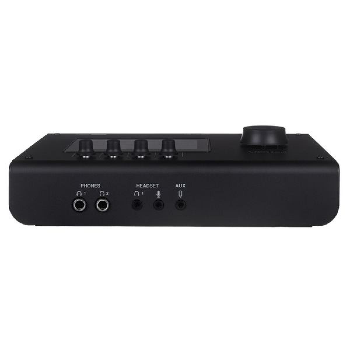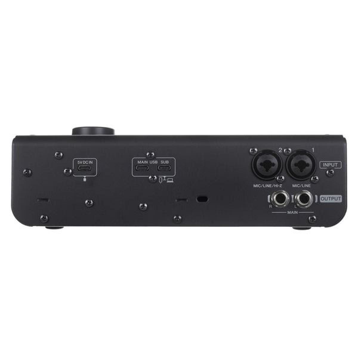 • 2 entradas combinadas de microfone/linha: XLR/jack de 6,3 mm (entrada 2 utilizável como entrada Hi-Z para instrumento;