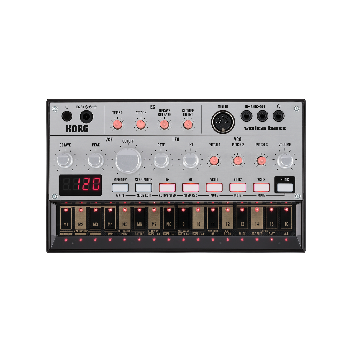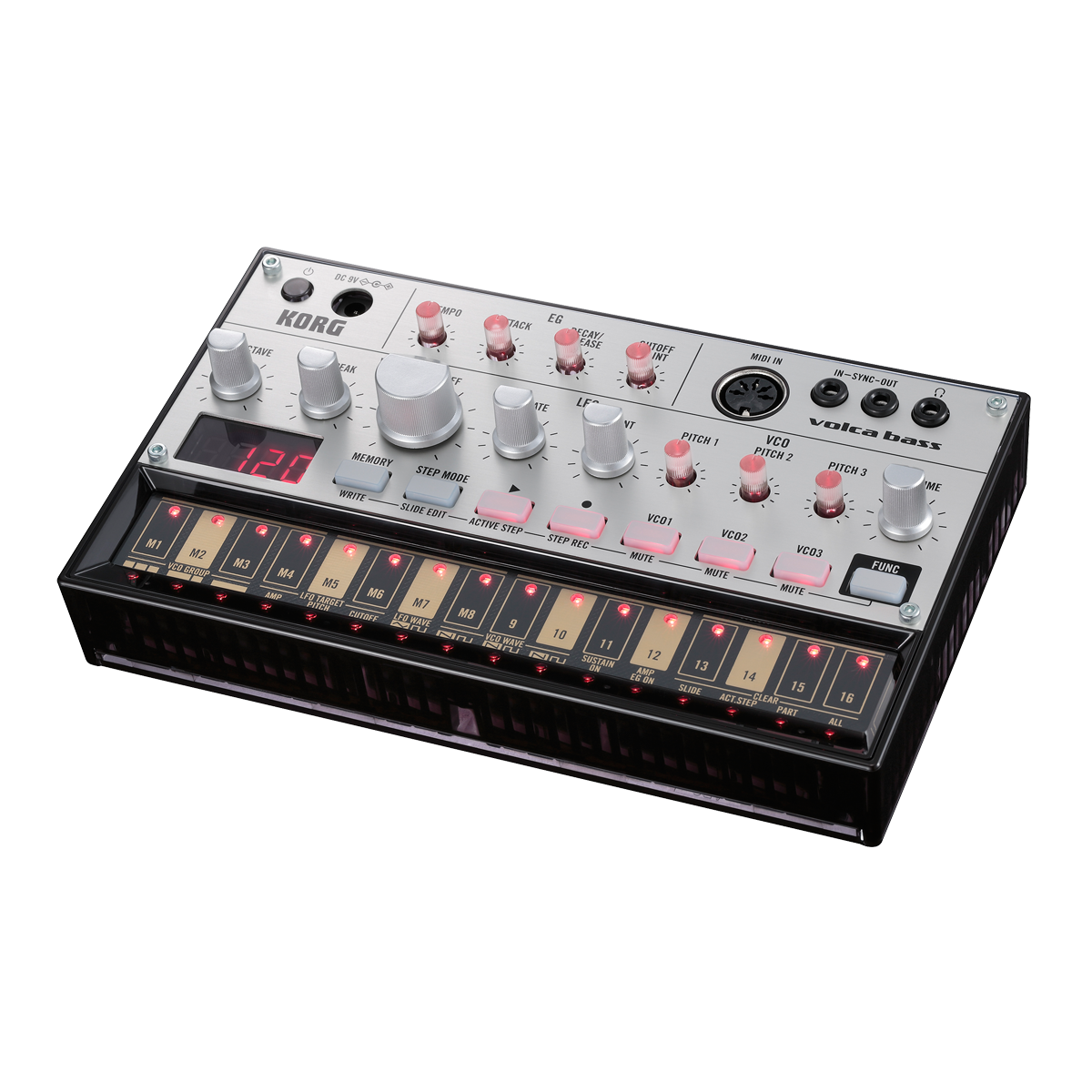 Com um step squencer derivado do Electribe, desenhado para facilitar a edição e permitir adicionar ou remover partes de forma dinâmica. Use as teclas os 16 passos para inserir notas intuitivamente e insira frases completamente diferentes para cada um dos três osciladores. Toque o teclado do painel de toque para gravar em tempo real e armazenar até 8 padrões de sequência na memória interna do Volca Bass.