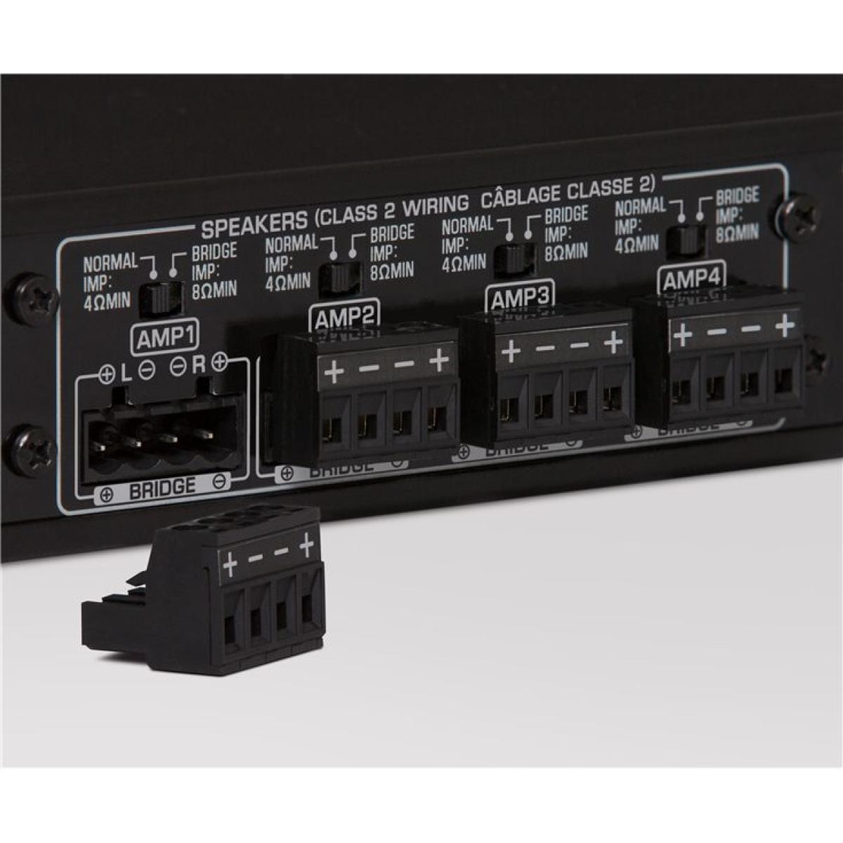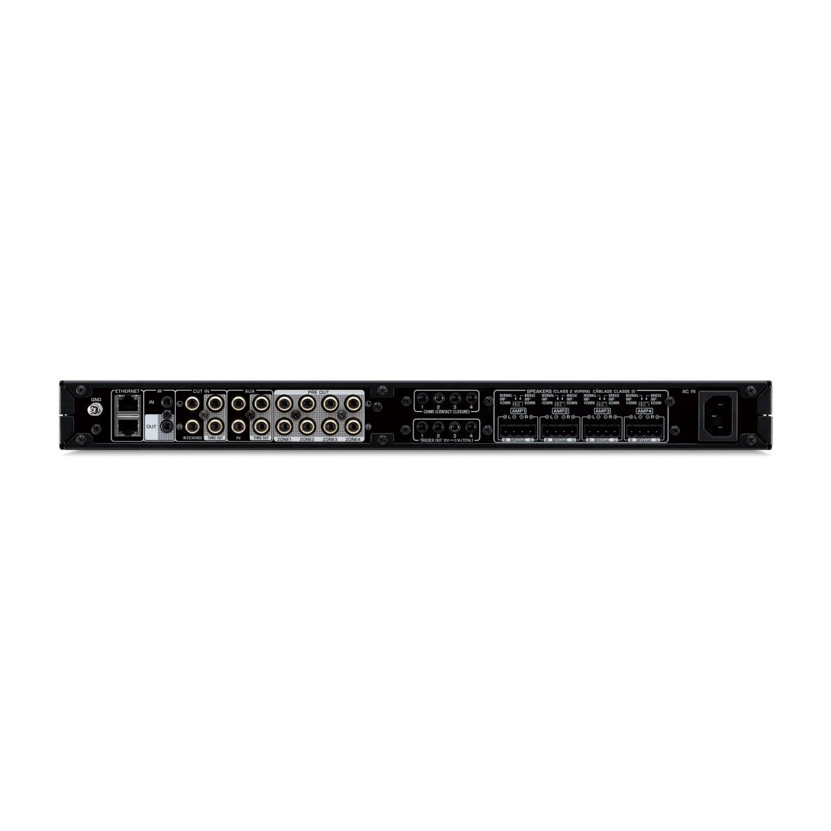 • Oito canais de amplificação de classe D para encantar os amantes da música, atribuíveis a qualquer zona, em ponte e com capacidade de 4 ohms, equipados com um circuito anti-zumbido de loop à terra de design exclusivo