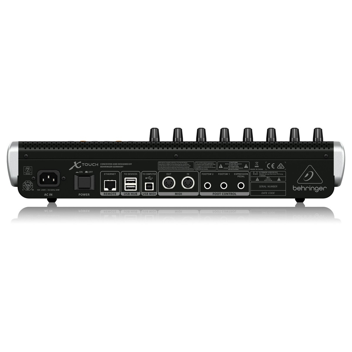 O X-Touch possui funcionalidade USB compatível com a classe, garantindo que seu controlador seja instantaneamente reconhecível em computadores Windows Além dos recursos USB, o X-Touch possui uma porta MIDI de 5 pinos, permitindo que você utilize um dispositivo MIDI externo e uma porta Ethernet para conexão numa rede sem fio. Conectores de pedal dedicados mais um controlador de pé único também fornecem a capacidade de controlar o X-Touch remotamente, enquanto um hub USB multi-TT alimentado permite que você conecte até 2 controladores extras para funcionalidade e expansão adicionais.