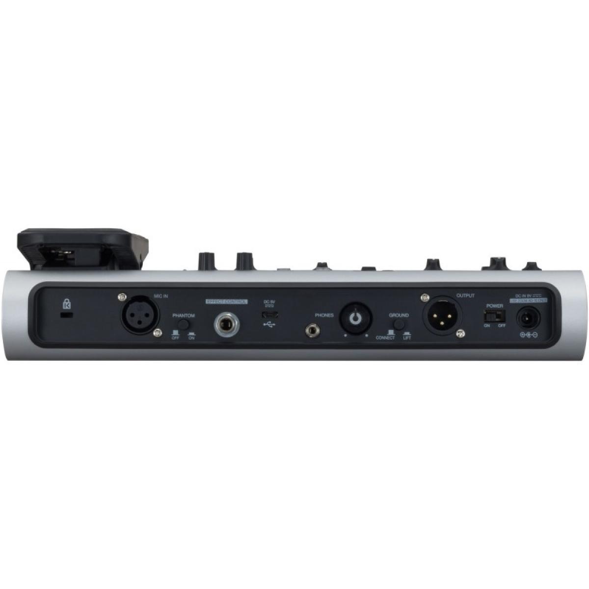 • Ligações: Entrada de microfone XLR (+ 48 V phantom power comutável), entrada de pedal (conetor de 6,3 mm), porta micro USB-B, saída de auscultadores (conetor estéreo de 3,5 mm), saída de linha XLR, entrada de alimentação ;